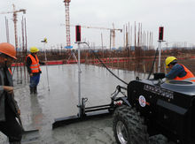 3、激光掃平儀控制砼澆注:在砼澆注之前將標高設定在柱筋上,并將準確的標高引到激光掃平儀控制系統,砼澆注人員刮平時將標高控制在比設計標高高出5—10mm范圍內,為下道激光整平機整平打好礎。