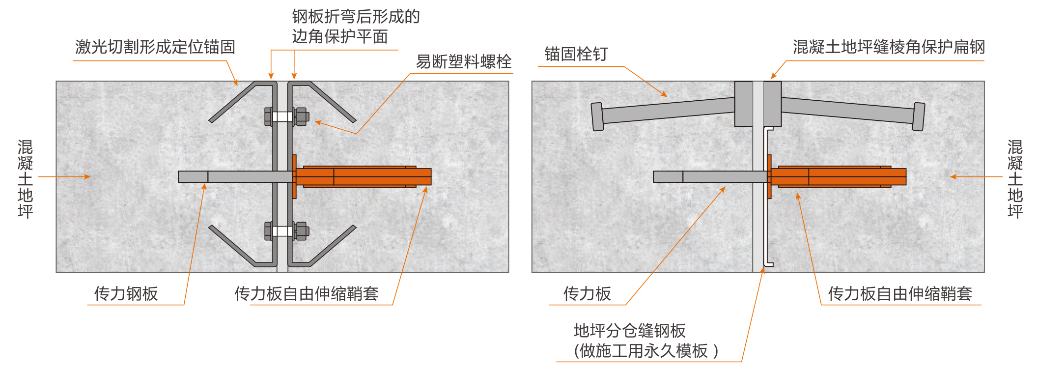 獨特的設計,相比傳統的傳力桿,傳力板,能夠使地坪在縱橫兩個方向伸縮,避免使用時出現裂紋。