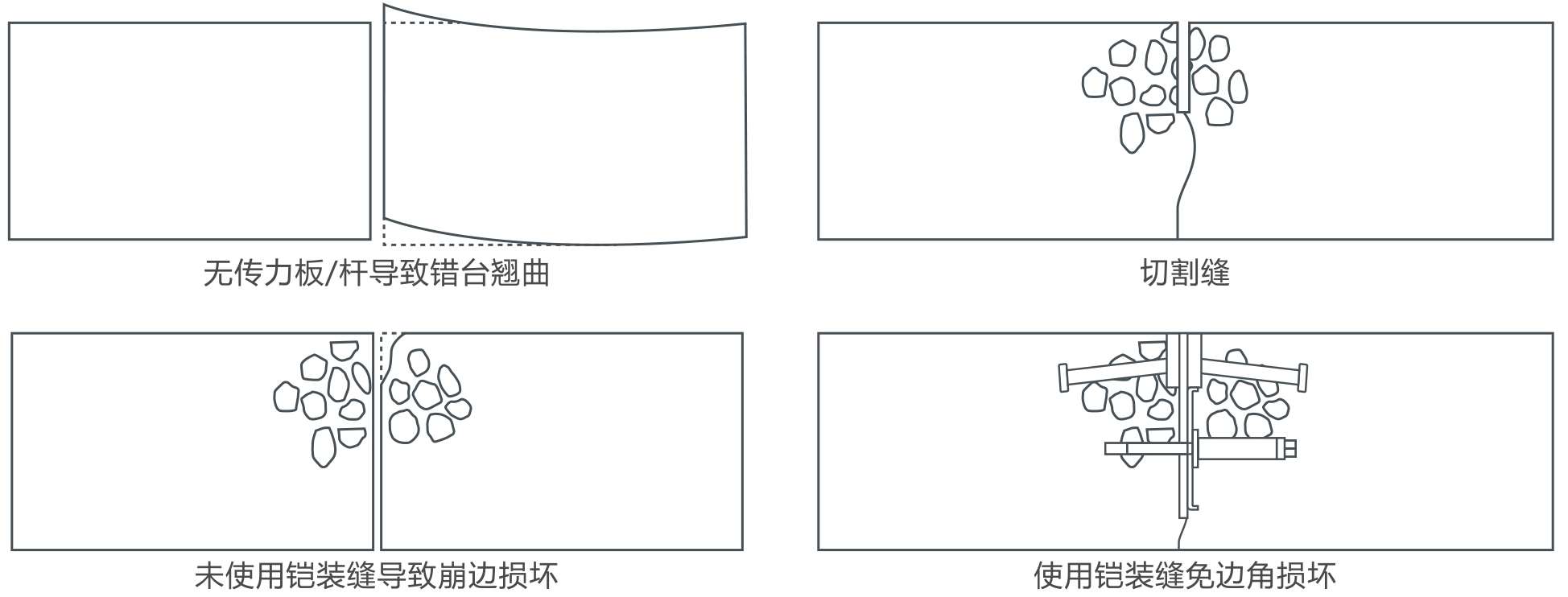 1 兩個(gè)板塊易發(fā)生錯(cuò)臺(tái)、翹曲及崩邊等情況;2 施工縫張開后,由于震動(dòng)密實(shí)導(dǎo)致骨料下沉,邊緣強(qiáng)度不夠容易崩邊損壞。